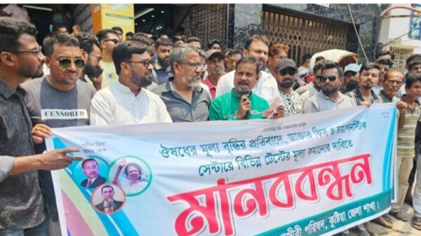ডাক্তারদের ‘ভিজিট’ সর্বোচ্চ ৫০০ টাকা করার দাবি কুষ্টিয়া প্রতিনিধি। চিকিৎসকের ‘ভিজিট’, ওষুধের মূল্যবৃদ্ধির প্রতিবাদ ও ডায়াগনস্টিক সেন্টারে বিভিন্ন স্বাস্থ্য পরীক্ষার ফি কমানোর দাবিতে মানববন্ধন কর্মসূচি পালন করেছে বাংলাদেশ সম্মিলিত পেশাজীবী